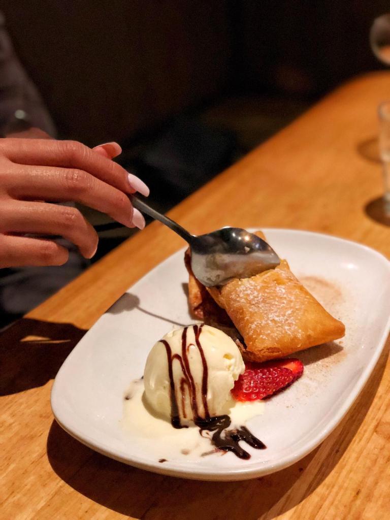 Apple cheesecake chimichanga served with ice cream and cinnamon. No better way to finish off our bottomless dinner, not too heavy and not too sweet. Just right!